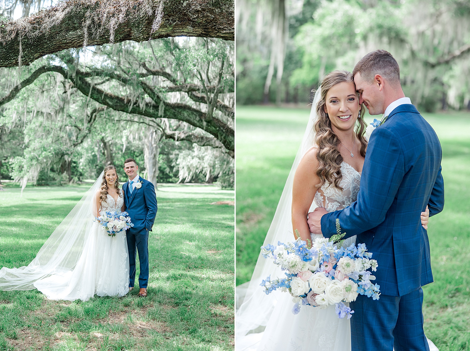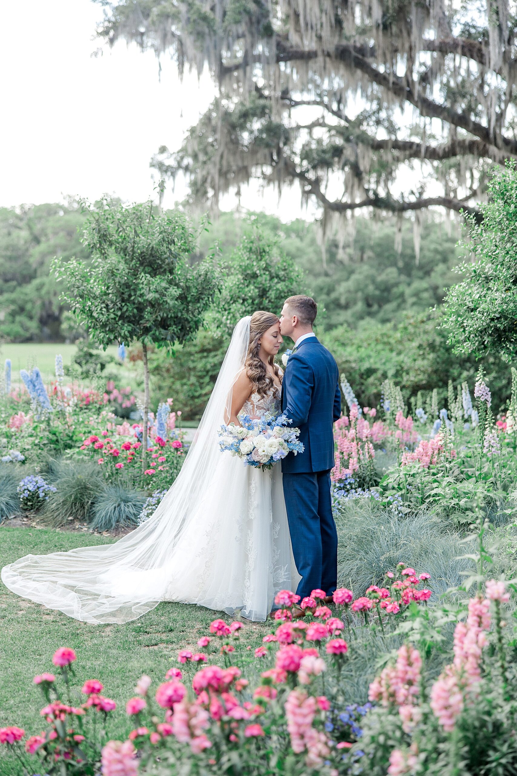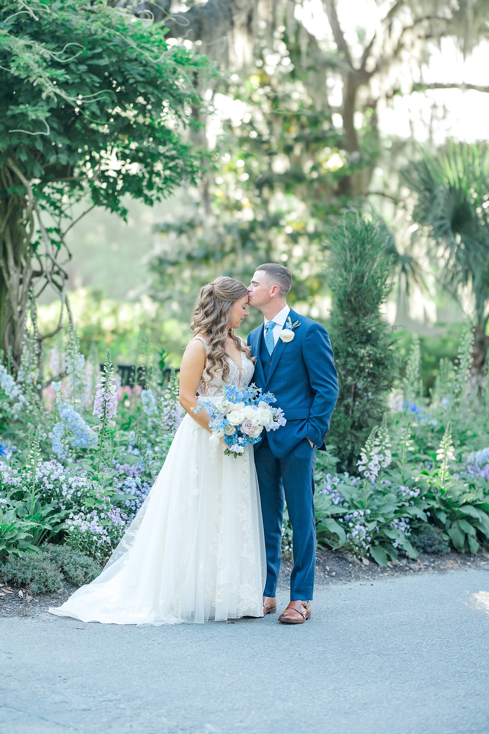 The day started with Courtney and her bridesmaids getting ready at The Inn at Middleton Place. There was so much excitement in the air as they got ready, with Courtney slipping into her stunning wedding dress, complete with a cathedral-length veil. Her bridal bouquet—a lush mix of white and soft blue blooms— was the perfect complement to her classic bridal look.